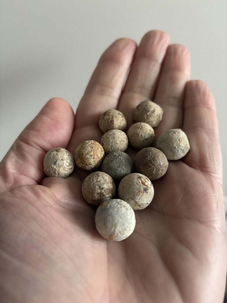 Het lijkt er dus op dat het niet zomaar een pijp is. Het lijkt een fragment van een oude loop te zijn. Een loop met een diameter van 18mm. Ik stop er een musketkogel van 16mm in. Dat past wel, maar hij sluit niet mooi af. Het is niet geheel toevallig dat ik inmiddels ook een handvol musketkogels met een kaliber van 16mm op hetzelfde veld gevonden heb.