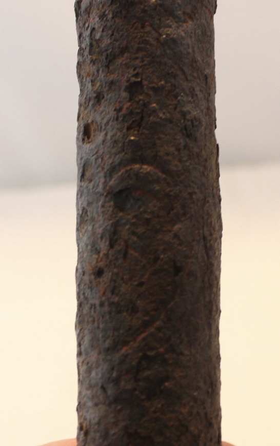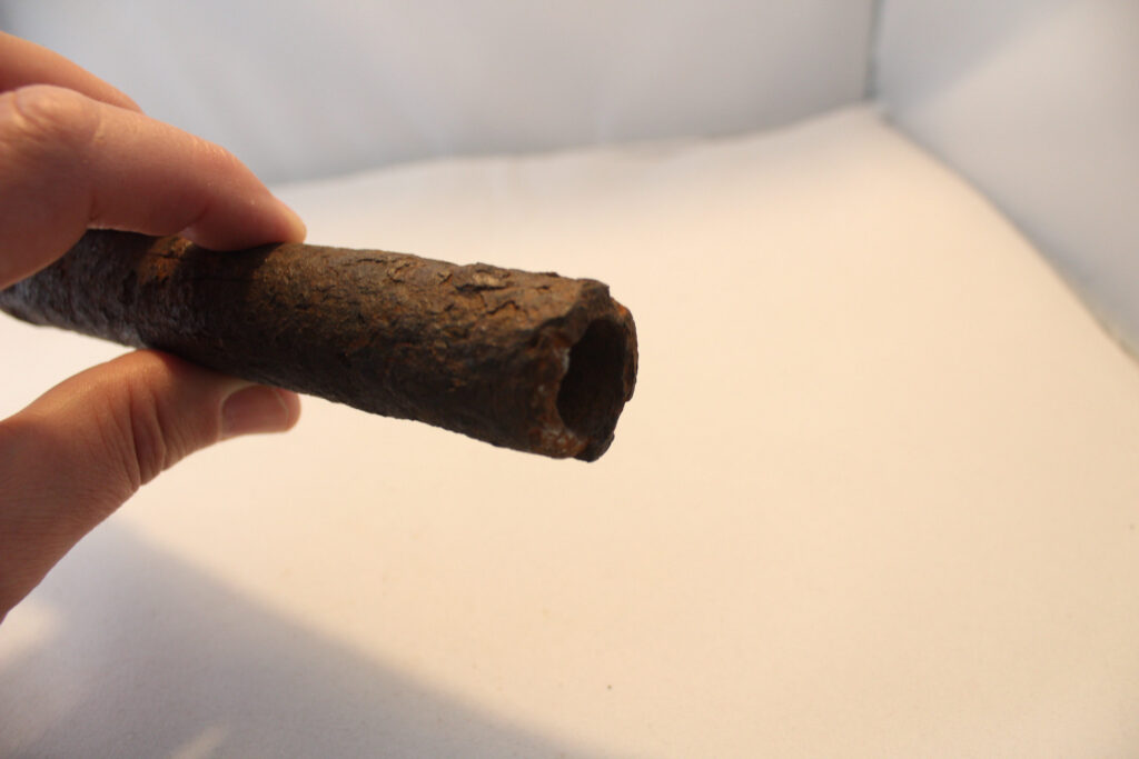 Eerst maar eens beschrijven wat ik feitelijk uit de klei heb getrokken. Het is een holle ijzeren pijp van ca 16cm. Het ene uiteinde is mooi afgewerkt met een glad kantje. Beetje beschadigd, maar wel duidelijk te zien dat het een uiteinde van iets is. Het andere uiteinde bevat een lelijke breuklijn. De pijp is dus langer geweest.