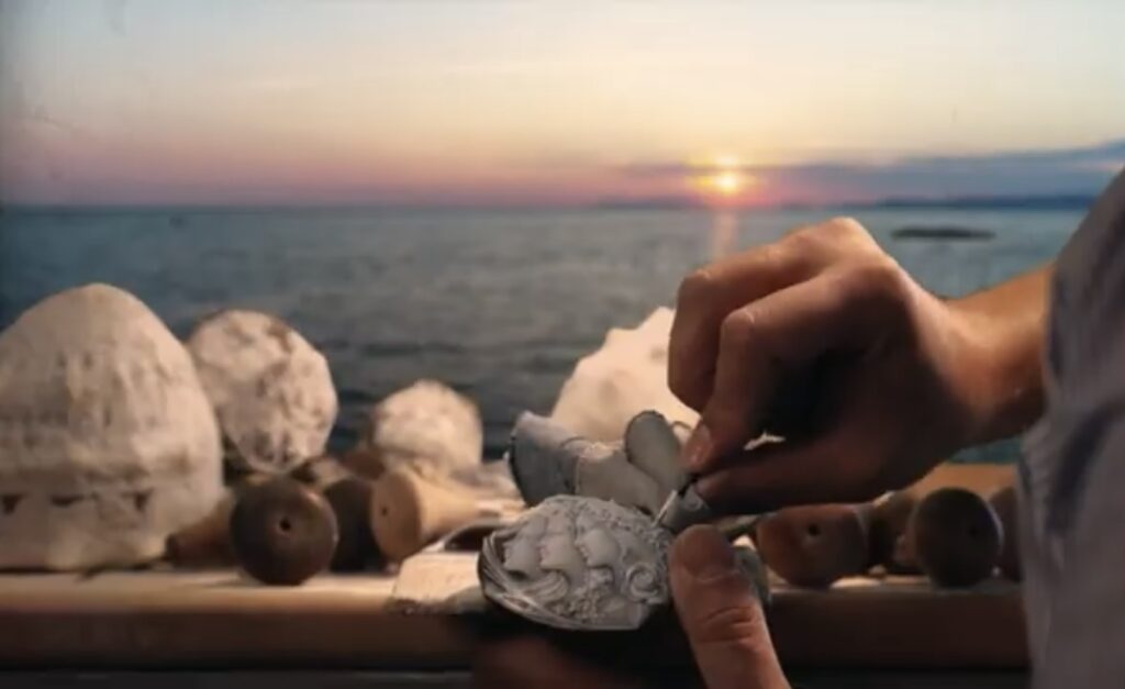 Deze foto toont een kunstenaar van Diluca Camee. Dit bedrijf uit Napoli snijdt de cameeën nog steeds met de hand uit schelpen. Grote schelpen. Heel kunstig, met zoveel detail. Knap werk.
